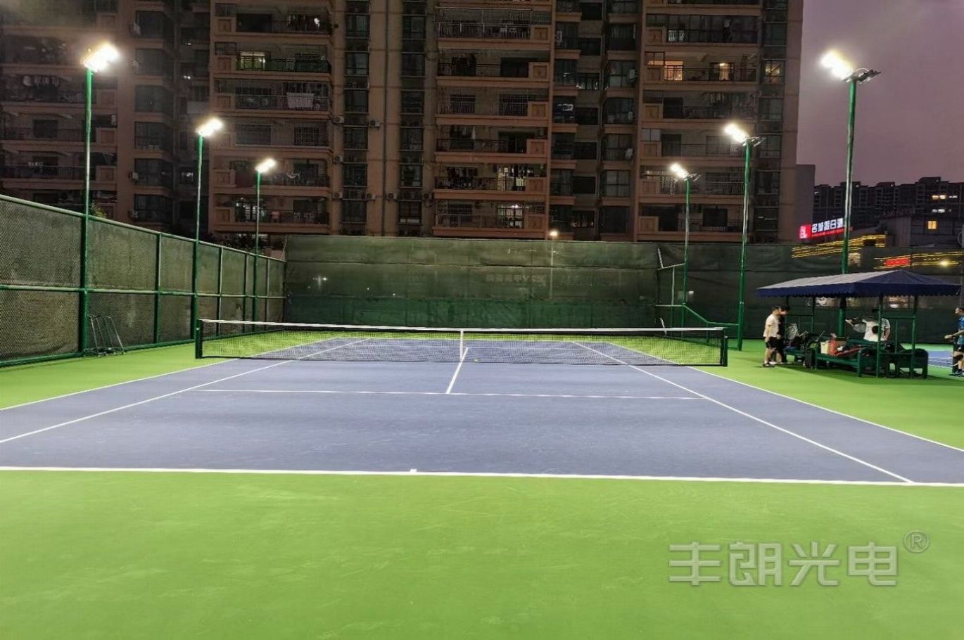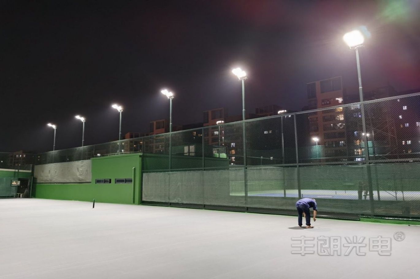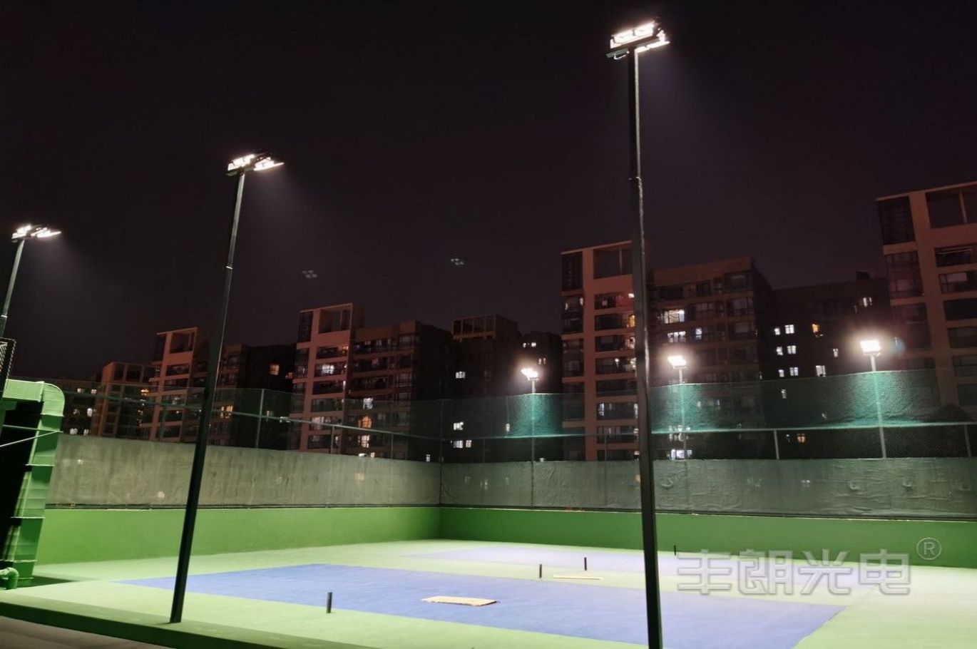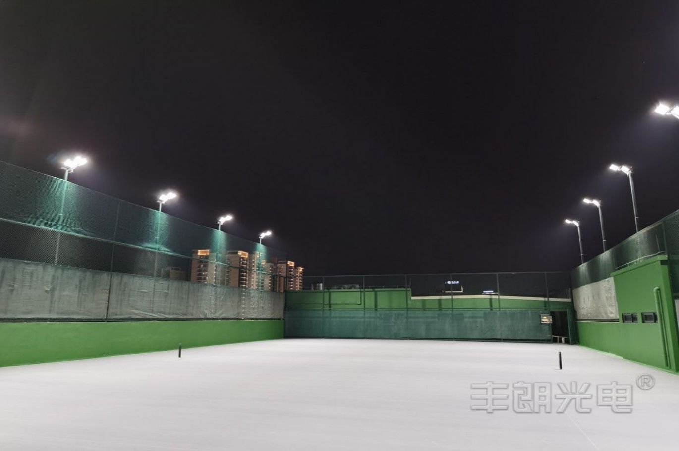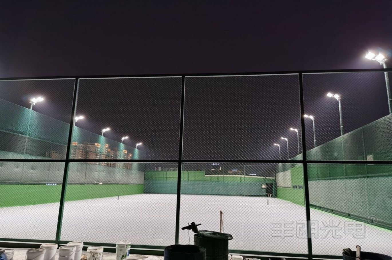 項目介紹: 項目位于東莞某網球協會樓頂,四個標準戶外網球場;采用MY球場燈系列(網球場專用燈),功率為480W;每個場地立12套6米燈桿;該網球場照明項目完工后,現場評測效果優秀:具有良好照明舒適性、場地光照均勻、極低眩光;照明指標超過行業照明要求,得到用戶的一致好評。