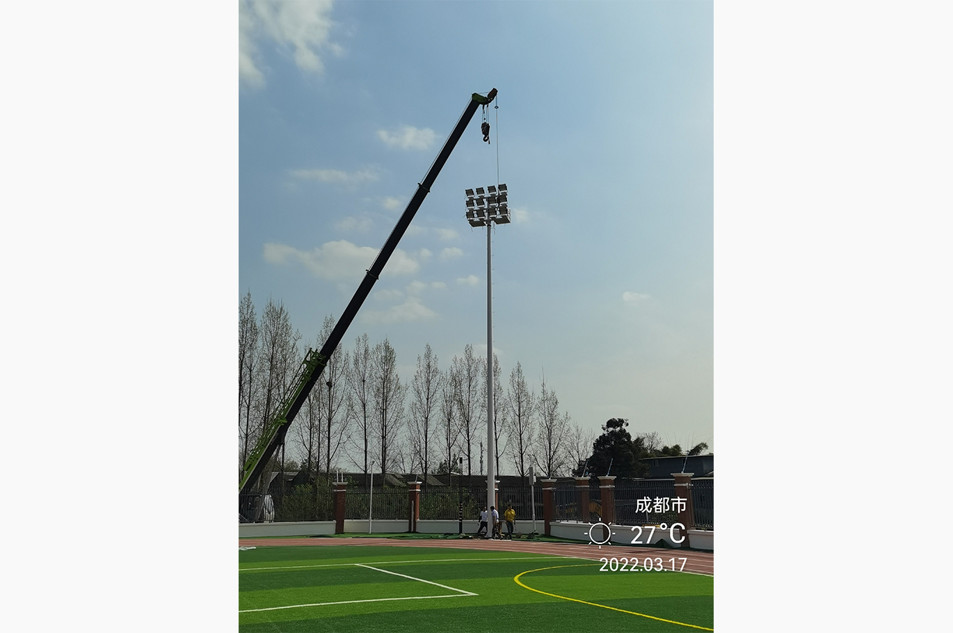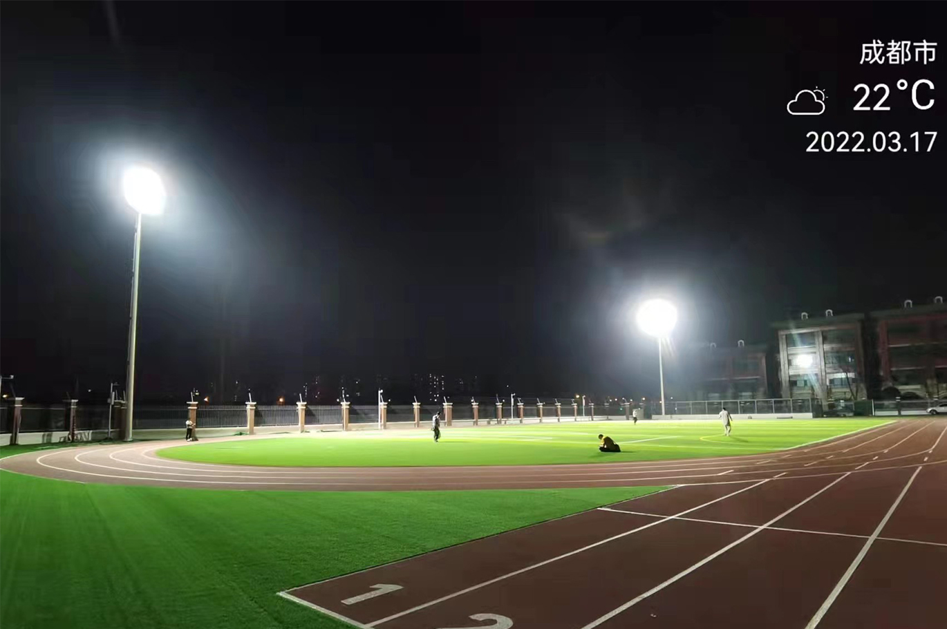 項目介紹: 路壩小學綜合體育場兩側立18米燈桿,采用我司480W球場燈(型號:FLT-TX1-480)24盞。完工后場地實際效果超過設計要求:亮度高、照度均勻、低眩光。足球場平均照度352 lx,田徑跑道平均照度155 lx。該照明項目得到學校領導和老師的一致好評。