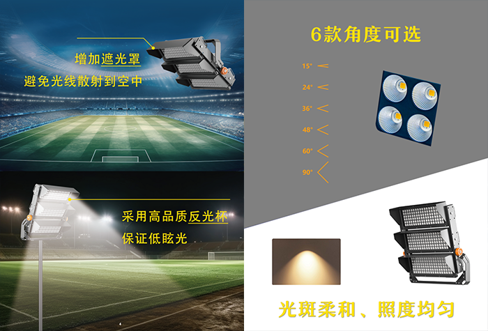 優化體育照明的眩光問題眩光是體育照明中一個重要的考量因素,它不僅會影響運動員的表現,還會影響到現場觀眾和電視觀眾的觀賞體驗。眩光發生時,人眼會感受到過強的光線或是不均勻的光照分布,導致視覺不適、視力模糊甚至短暫的失明。這在高速運動的體育比賽中尤其危險,可能會導致運動員判斷失誤,增加受傷的風險。對于觀眾來說,眩光會降低觀看比賽的舒適度和滿意度,影響整體的觀賽體驗。為了降低眩光,我們在設計新款防眩球場燈時采取了幾項關鍵技術措施:采用反光杯設計:與常規的透鏡設計相比,反光杯能更有效地控制光線的傳播方向,減少直接進入觀眾視線的強光,從而大幅度降低眩光現象。光斑柔和、照度均勻:通過優化光源的分布和反光杯的形狀,我們實現了更柔和的光斑和更均勻的場地照明,這有助于減少光照強度的突變,降低眩光的產生??烧{節的照射方向:燈具整體及其各個模組的可旋轉設計允許精確調節照射方向,避免光線直接照射到運動員或觀眾的眼中,進一步減少眩光的可能性。通過這些設計改進,我們的新款防眩球場燈能夠顯著降低眩光,為運動員和觀眾提供更加舒適和安全的照明環境。