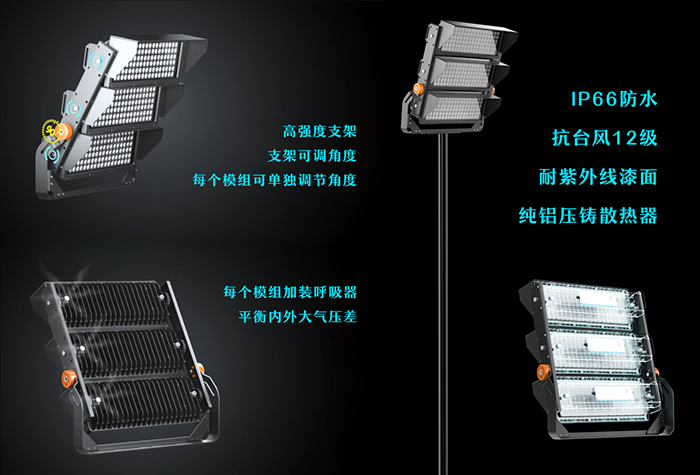 打造高可靠的球場燈確保球場燈具備高可靠性,我們從電氣可靠性和結構可靠性兩個關鍵方面入手:電氣可靠性:優質元器件:我們采用高品質的LED芯片、電源驅動。這些元器件經過嚴格測試,能夠在各種電壓和溫度條件下穩定工作,從而保證了整個燈具的電氣系統長期穩定運行。電氣保護措施:設計中包含了過電壓、過電流、短路保護以及靜電放電(ESD)防護措施,確保電氣系統對突發電氣事件有良好的抵抗力,進一步提升了產品的可靠性和安全性。結構可靠性:壓鑄散熱器:采用高質量的壓鑄鋁作為散熱器材料,不僅提供出色的熱導性能,幫助快速分散LED產生的熱量,保持光源穩定運行,同時也增強了燈具的結構強度,使其能夠承受物理沖擊和長期的使用磨損。防水密閉性:燈具每個模組加裝呼吸器,保證防水密閉性和腔體內氣壓平衡。有效防止雨水、濕氣和塵埃侵入,防護等級達到IP66??古_風12級:結構設計考慮到極端天氣的挑戰,特別是抵抗高風速的能力。通過增強安裝支架、優化燈體形狀和使用抗風承壓設計,確保燈具即使在12級臺風的強風條件下也能穩固可靠地工作。通過這些綜合措施,我們確保了球場燈具在電氣和結構兩個層面上的高可靠性,不僅能夠承受極端的自然環境挑戰,也能保證長期穩定的電氣性能,滿足各類體育場館的照明需求。